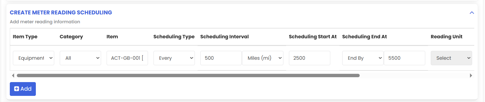 - Current Meter Reading (required) — Enter the asset's current meter reading at the time of setting up the scheduler. This is the baseline from which the system begins tracking toward the next threshold.