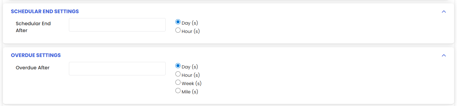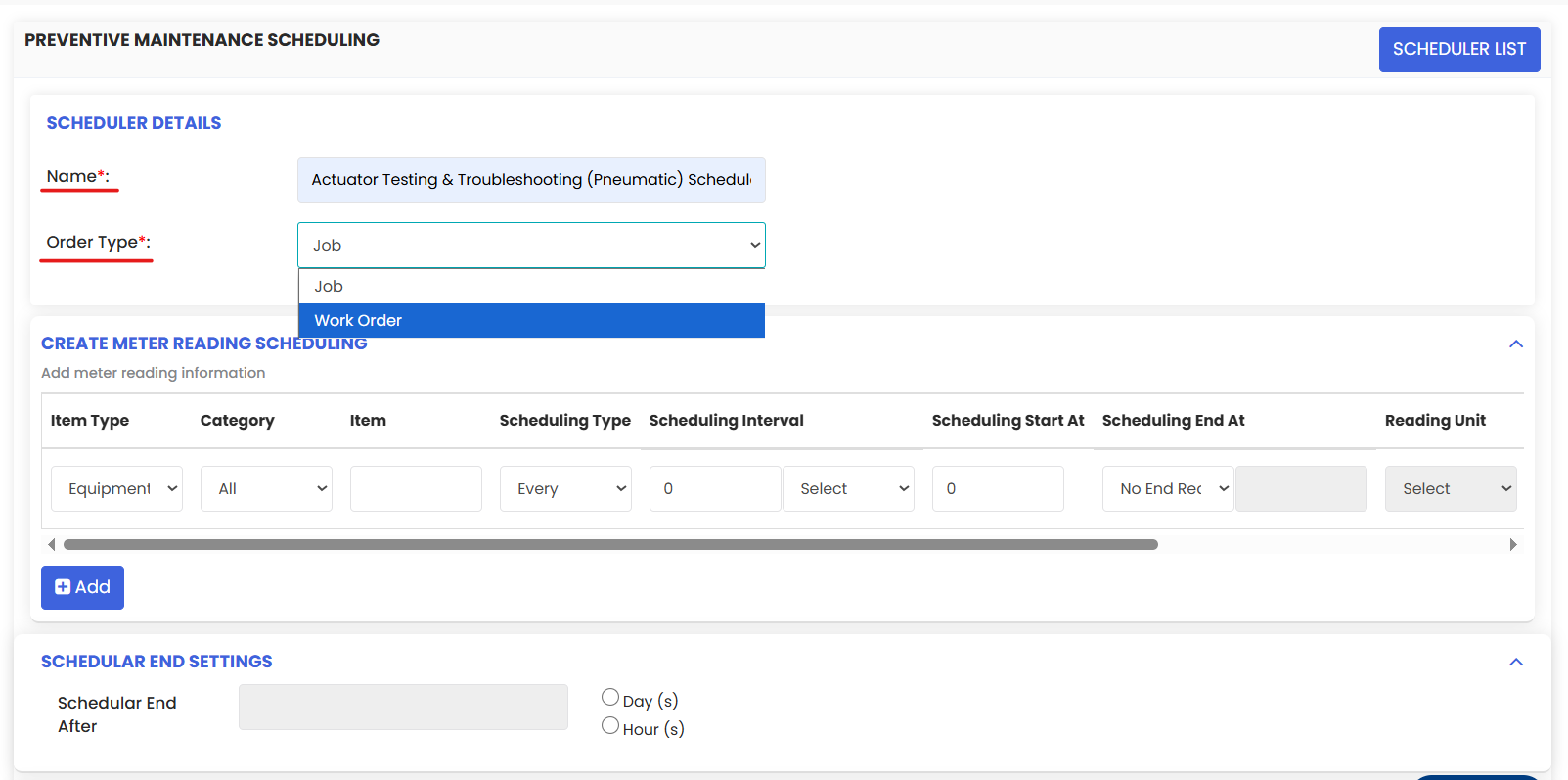 - Scheduler End (optional) — Set a date on which the scheduler should automatically stop, regardless of meter readings. Useful if the asset is due for replacement or disposal by a certain date.