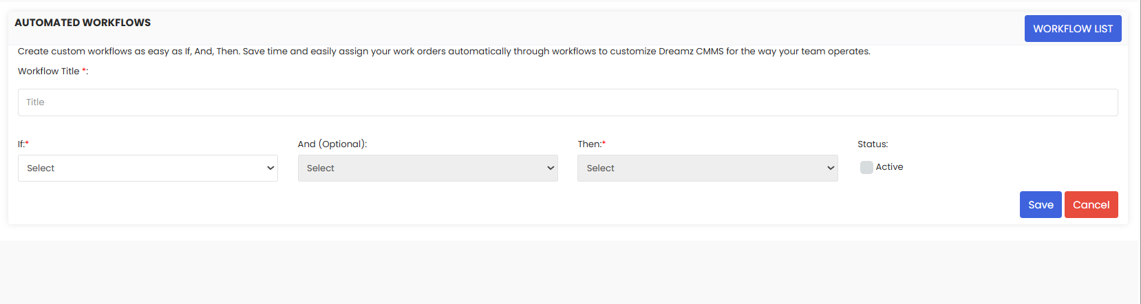 Workflow Automation in DreamzCMMS lets you automatically route and update records based on rule-driven logic so repetitive maintenance steps happen instantly and consistently. You can define IF → (optional) AND → THEN rules that trigger automated actions like assignment, status updates, notifications, and more — reducing manual work and ensuring reliable execution every time.
