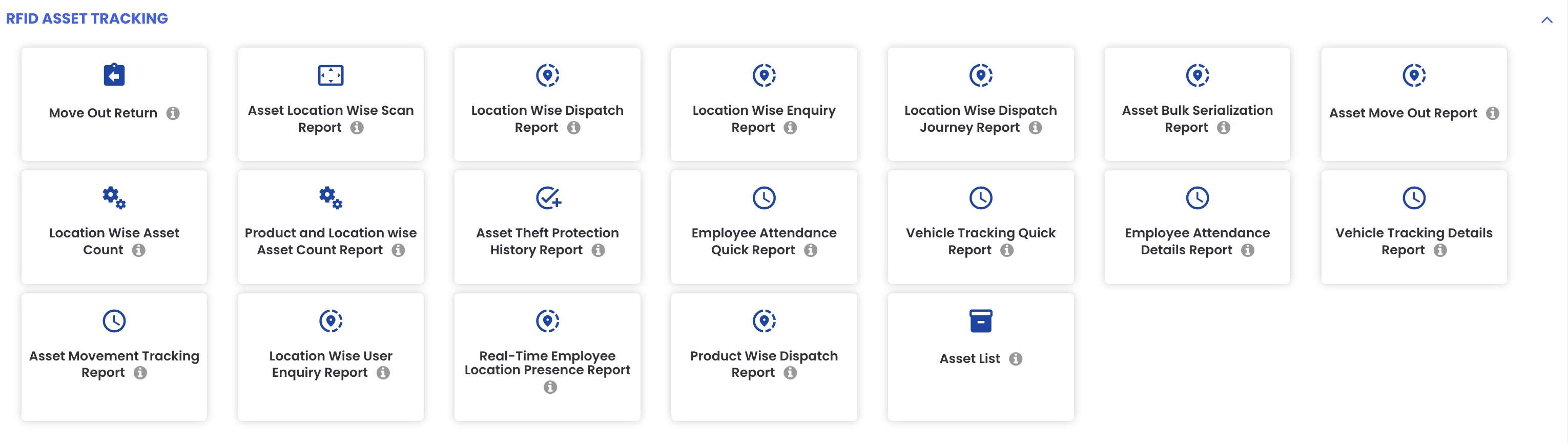 The RFID Asset Tracking category includes the Location-Wise Dispatch Report, Dispatch Report, Asset Bulk Serialization Report, Asset Move-Out Report, and other related reports that help track and manage assets using RFID data.