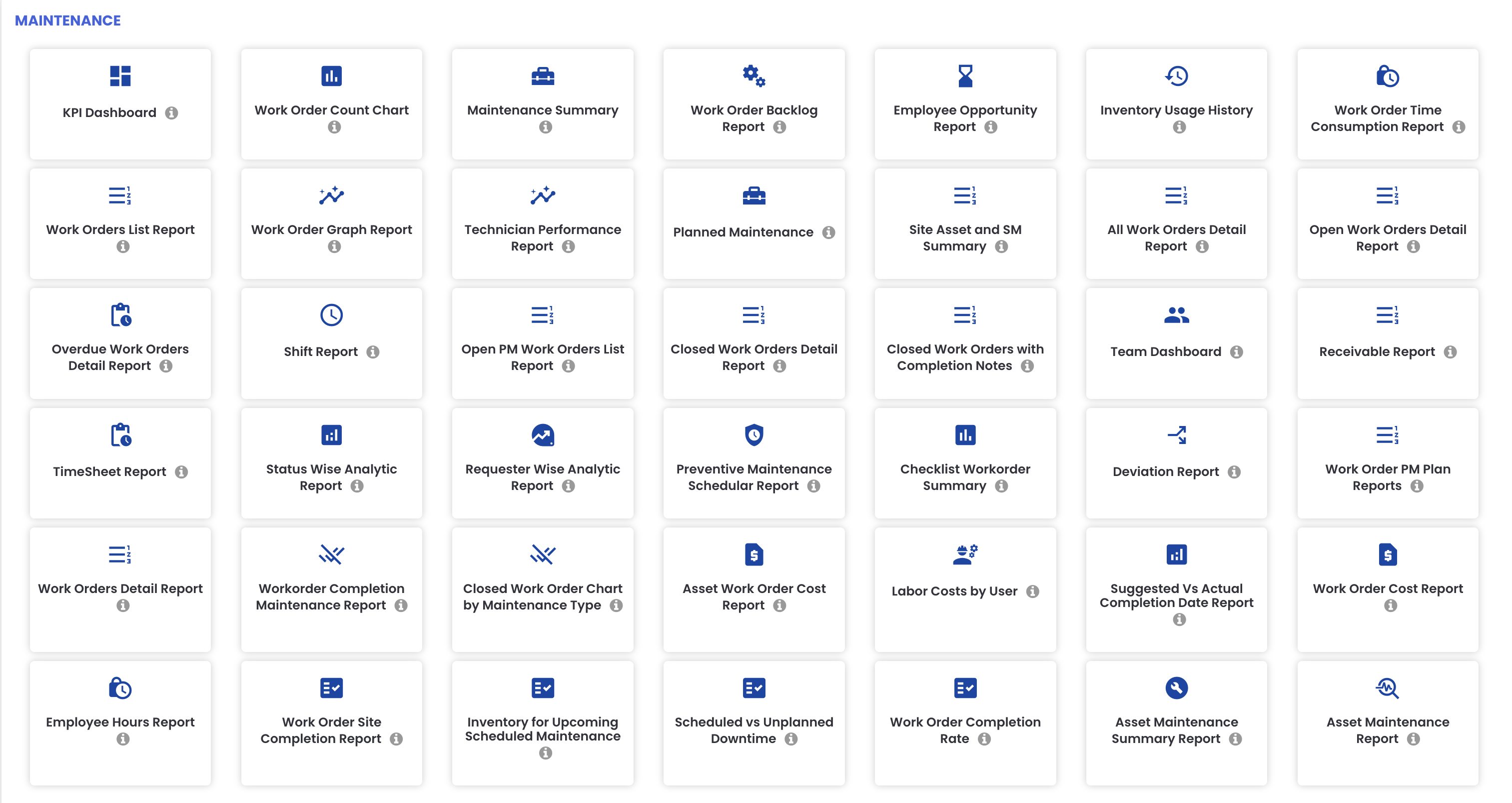 On the All Reports page, the Maintenance Report is one of the first reports visible. This is the primary report for viewing all work orders and jobs created in the system.