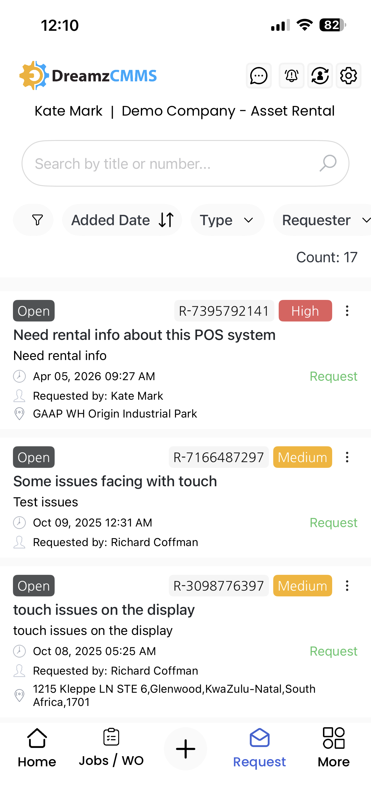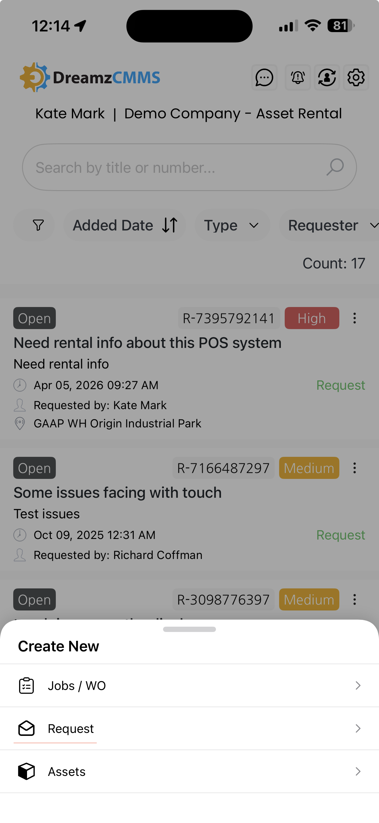 The Request section in DreamzCMMS Asset Rentals allows you to raise and manage requests directly from the mobile app. You can view all existing requests, create new ones, and attach supporting files such as photos or videos. Key highlights include: