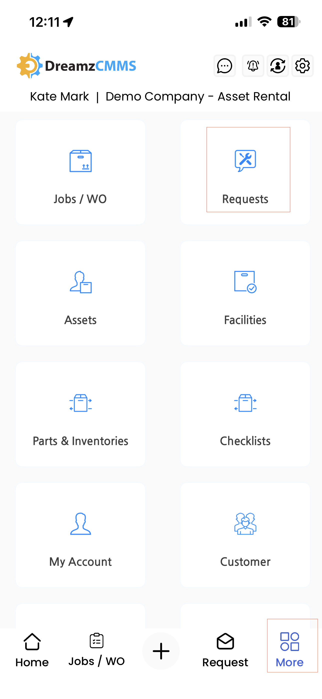 Open the DreamzCMMS mobile app and tap on Request from the bottom navigation menu. Alternatively, tap on the More menu and select Requests from the list of options.