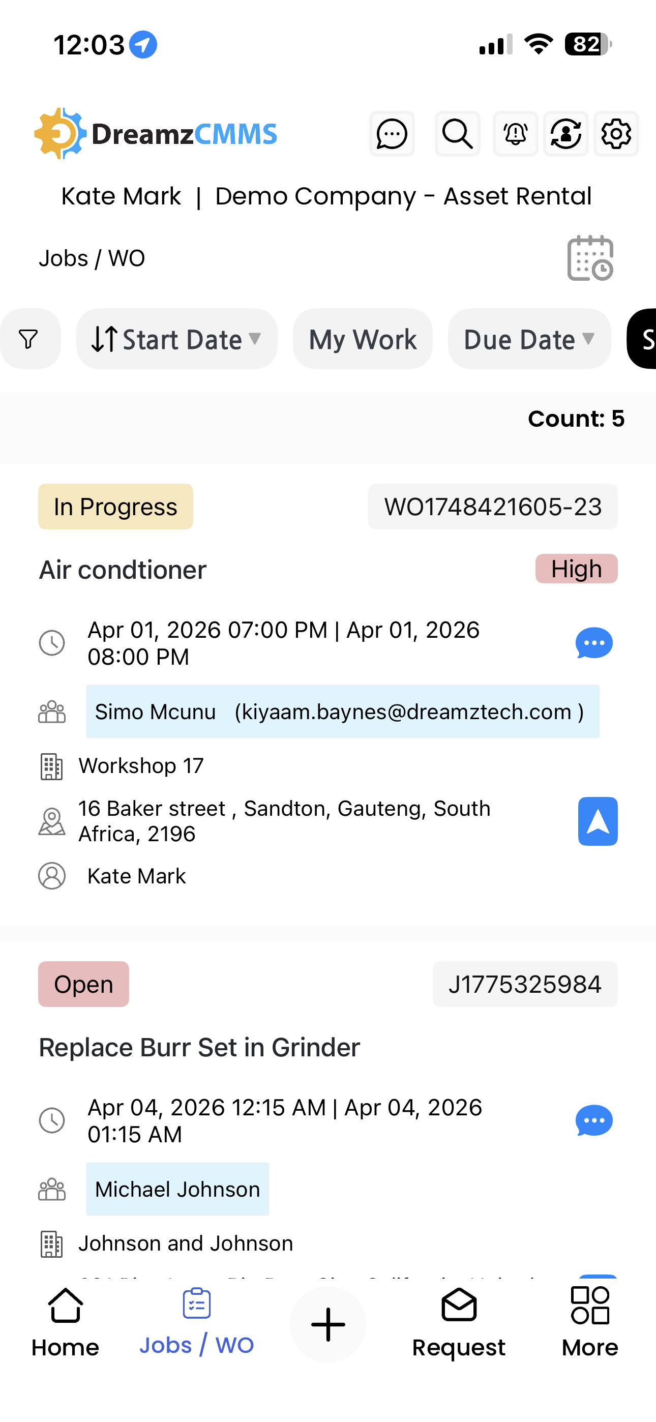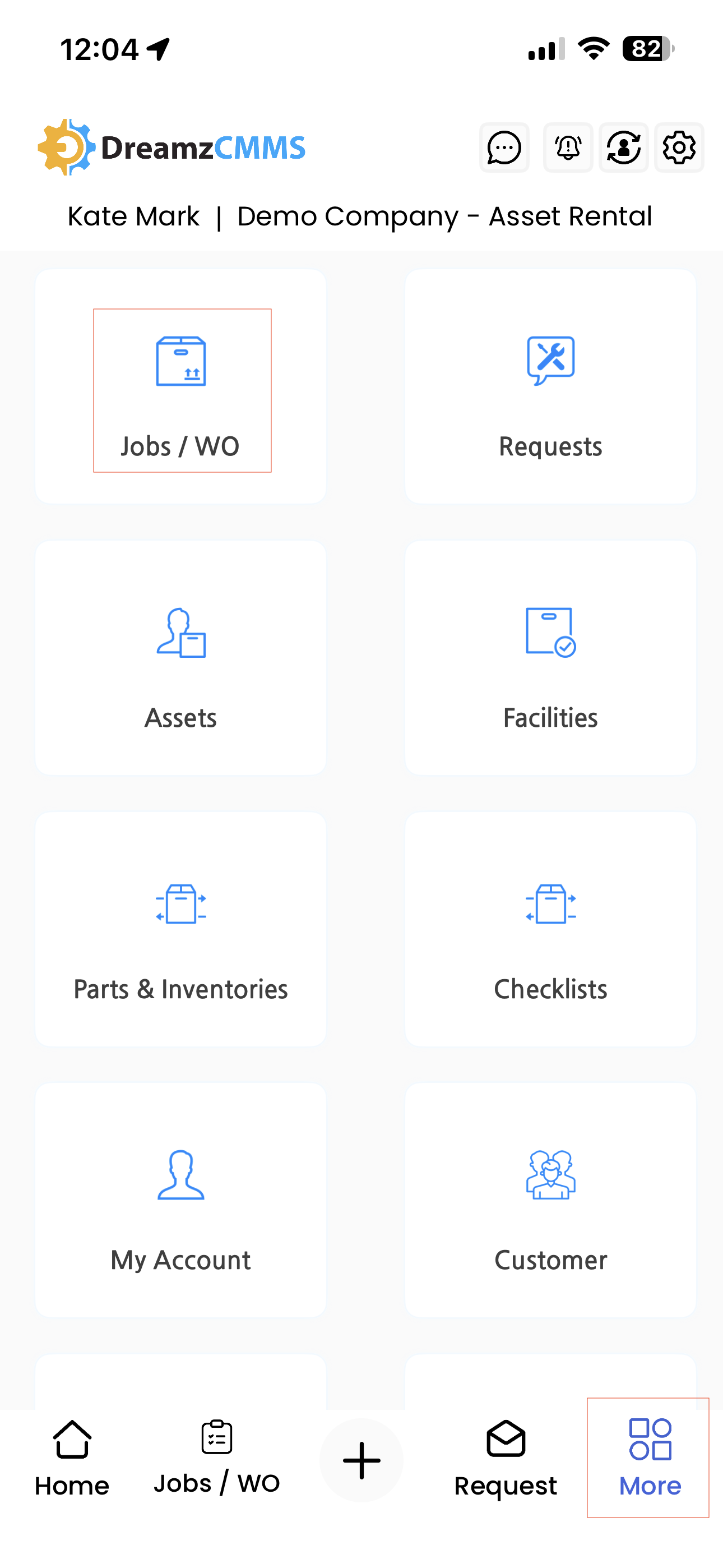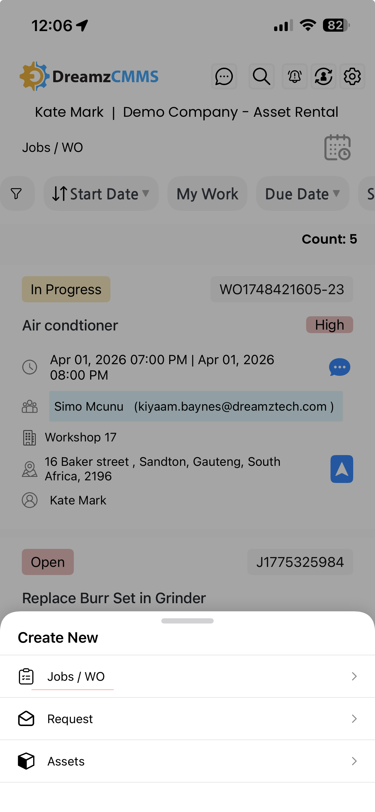 The Jobs and Work Orders section in DreamzCMMS Asset Rentals allows you to view and manage all jobs and work orders directly from the mobile app. You can access them from the home screen or the More menu, and create new entries quickly with all the relevant details. Key highlights include: