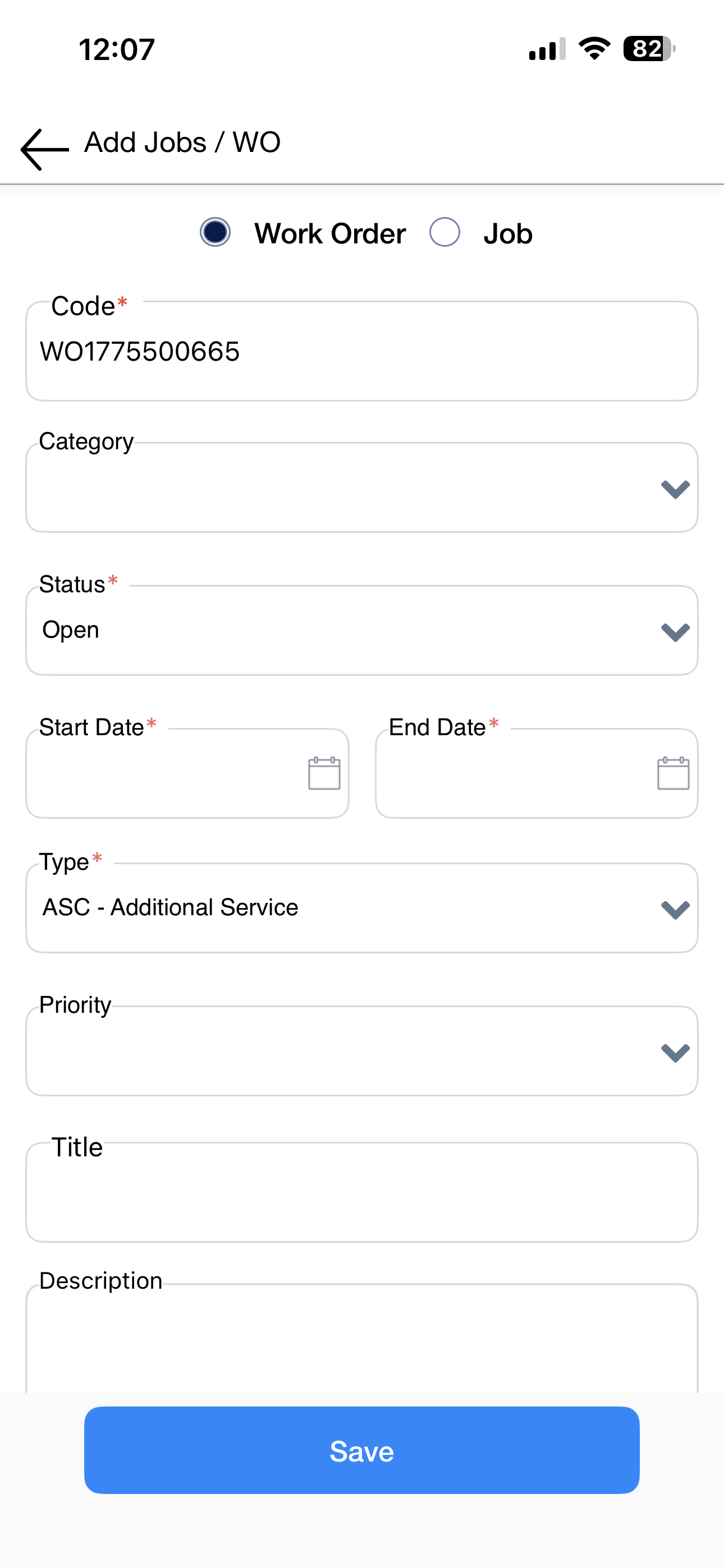 Tap the plus icon and select Jobs Work Order. Fill in all required fields including category, status, dates, type, and requested details, then tap Save.