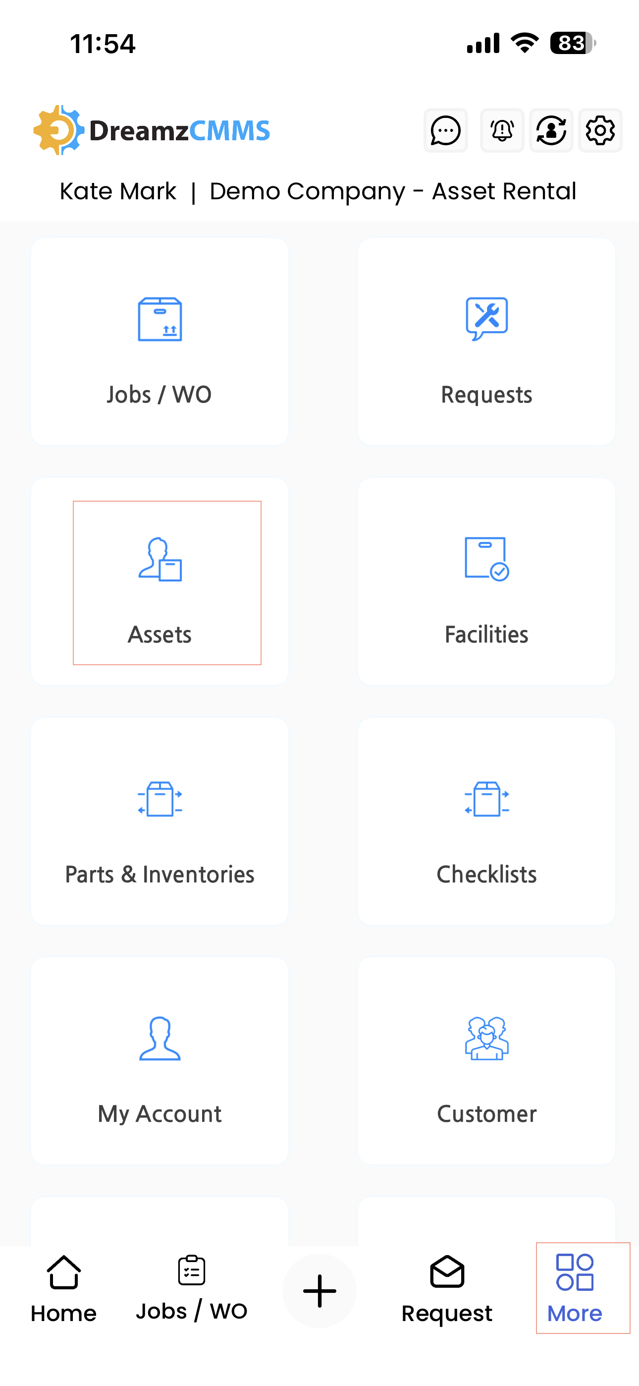 Tap on the More menu in the DreamzCMMS mobile app and select Assets from the list of available options. This will take you to the Assets page.