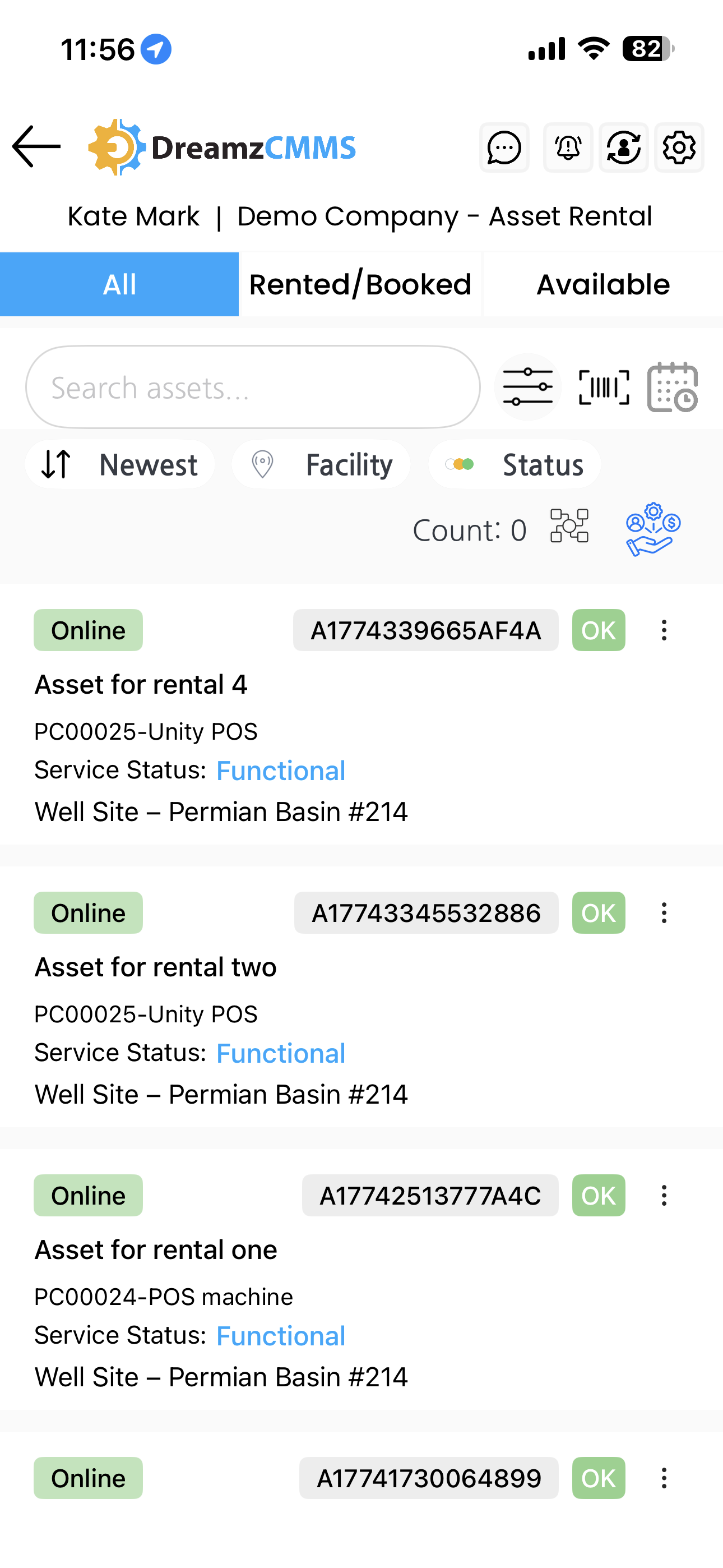 The Assets section in DreamzCMMS Asset Rentals gives you a complete view of all your assets directly from the mobile app. You can filter assets by their availability status — viewing all assets, rented and booked assets, or only available assets — making it easy to manage your rental inventory at a glance. Key highlights include: