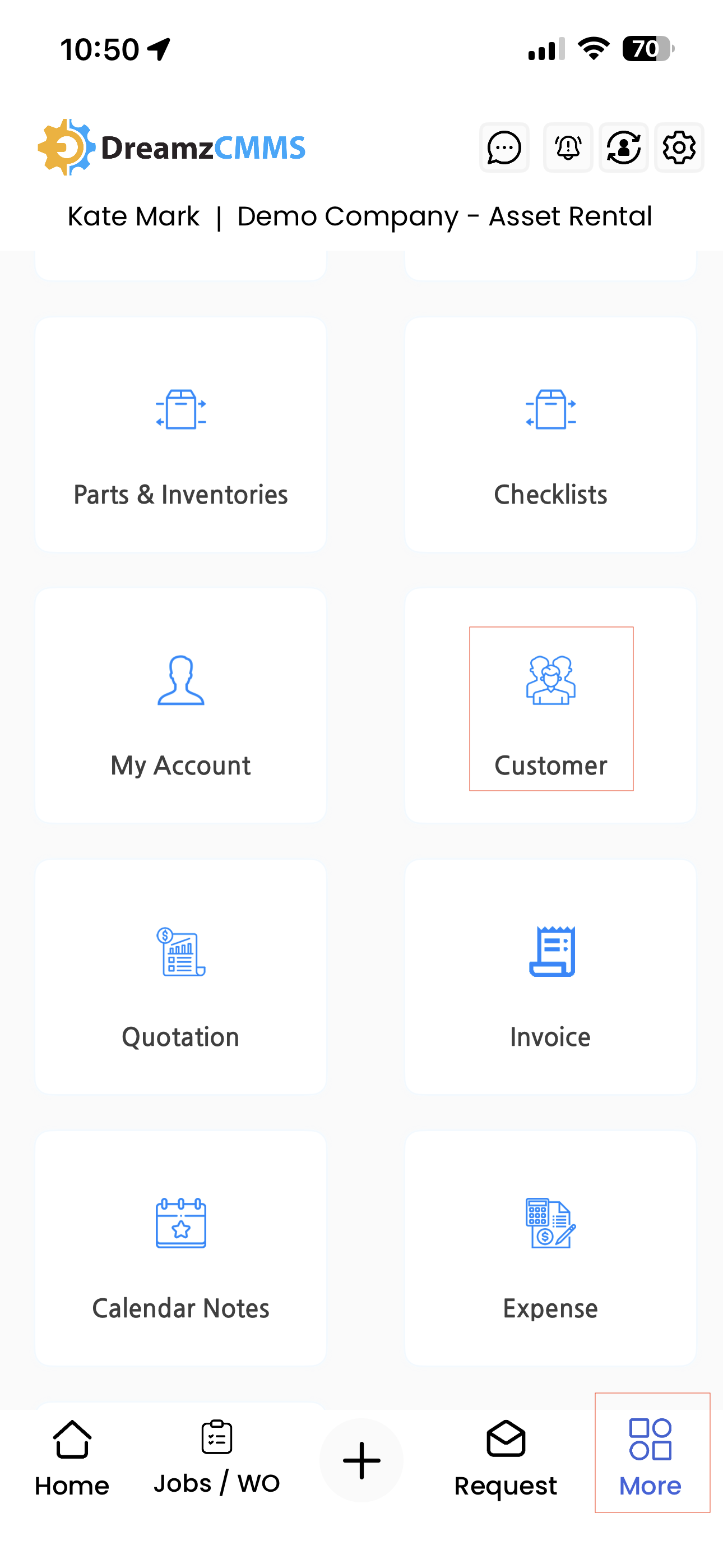 Open the DreamzCMMS mobile app and tap on the More menu. From the list of options, select Customer to open the customer section.