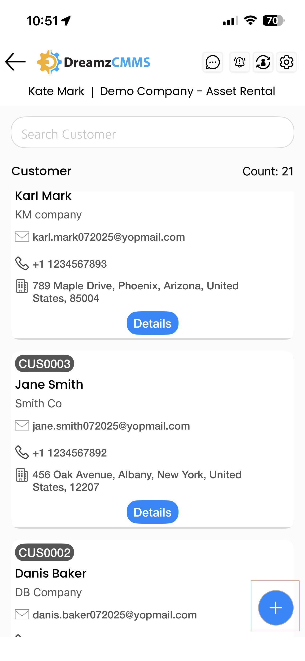 The Customers section in DreamzCMMS Asset Rentals allows you to view and manage all your customers directly from the mobile app. You can browse the full customer listing and add new customers quickly with auto-populated codes and detailed contact information. Key highlights include: