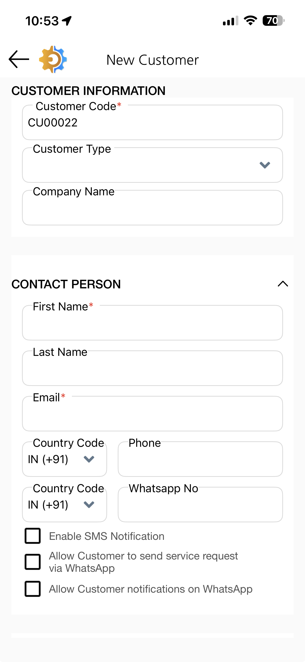 To add a new customer, tap the plus icon on the listing page. You will be redirected to the Customer Addition page where the customer code will be auto-populated by the system.