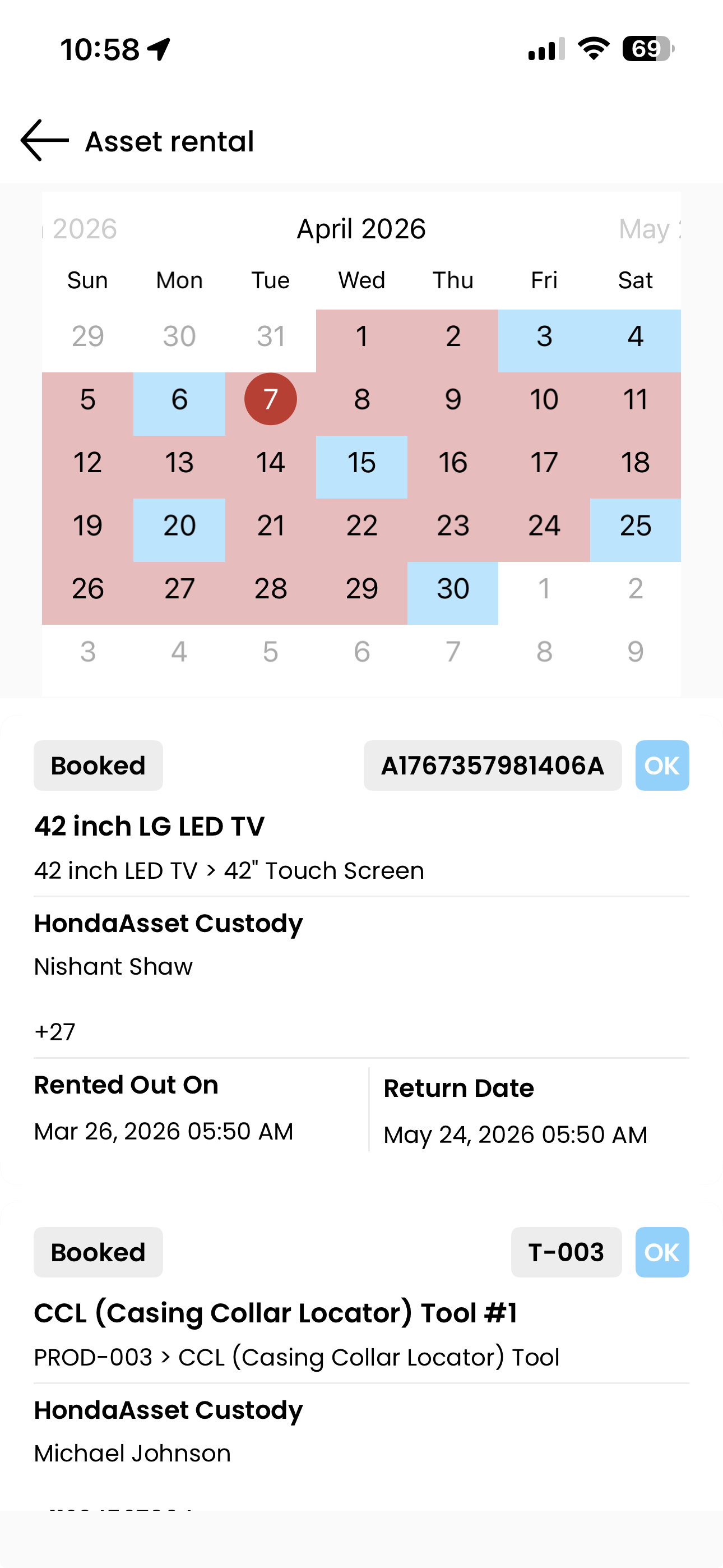 Tap on any date on the calendar to refresh the page and view all assets associated with that date, including their current status and rental details.