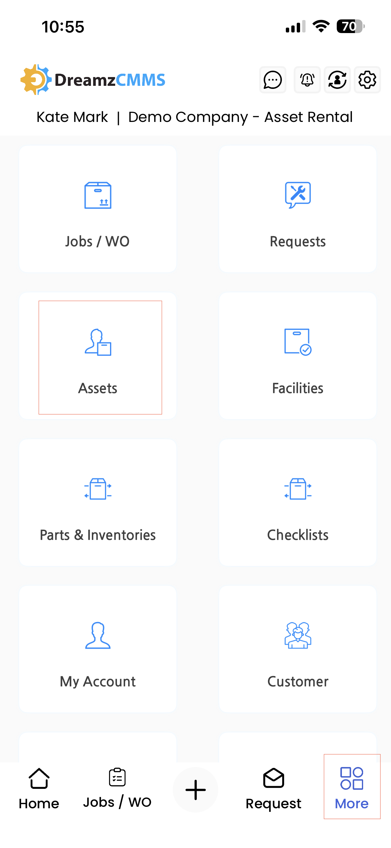Launch the DreamzCMMS mobile app. From the dashboard, tap on More in the header section and select Assets to open the Assets page.