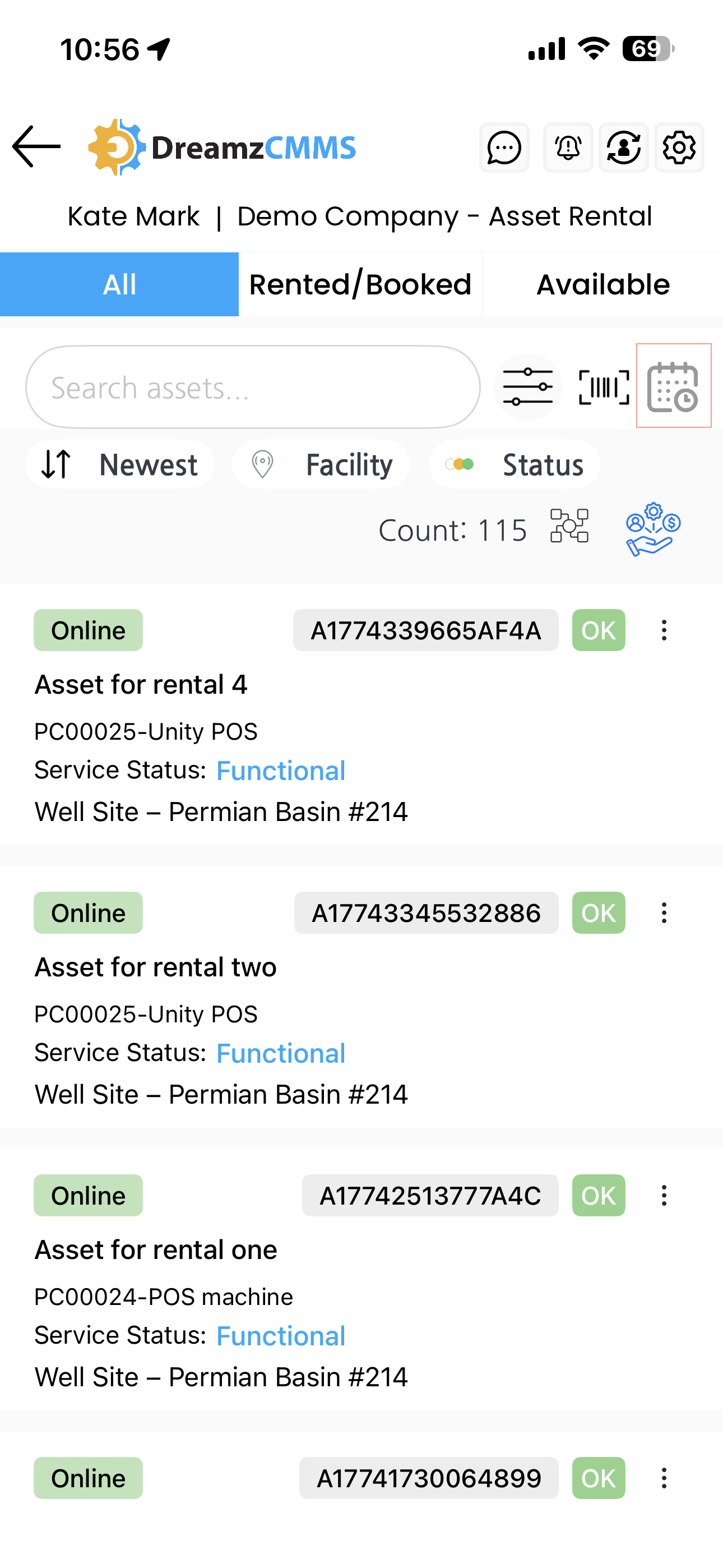 - Rented or Booked – shows assets that are currently rented or have an active booking