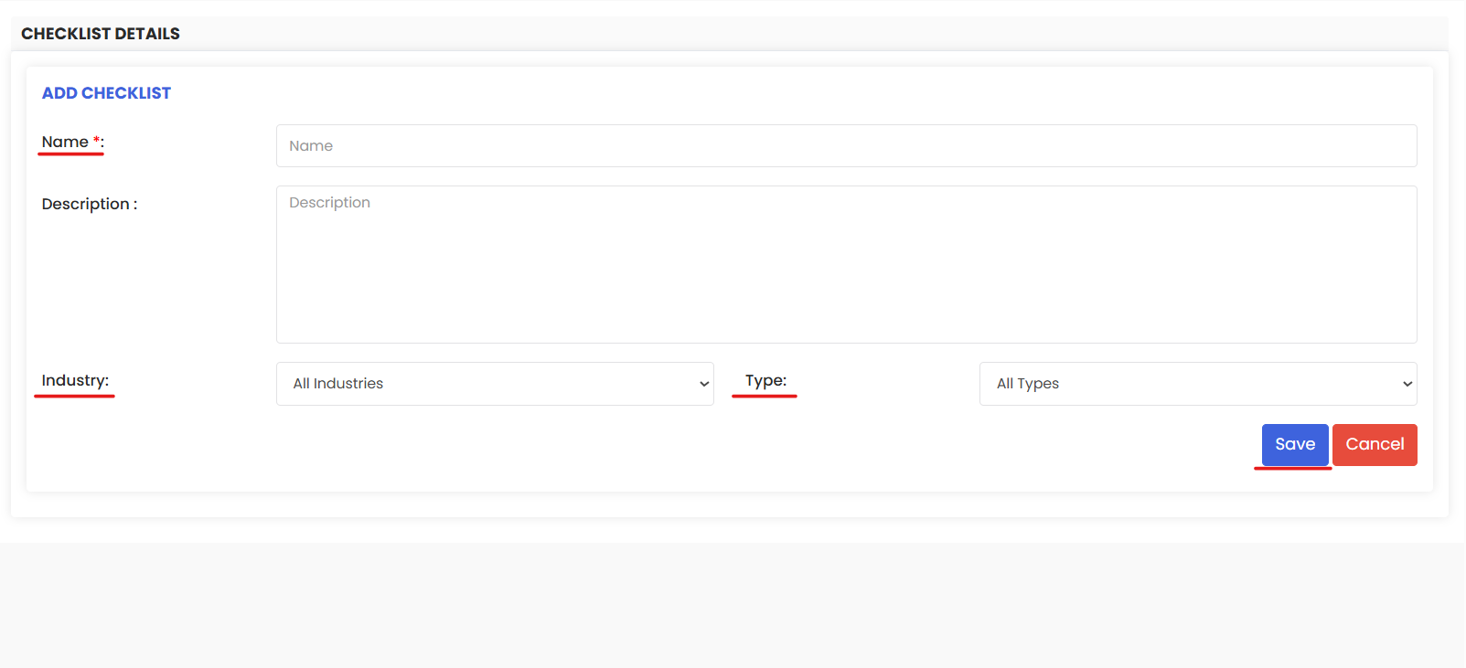 Add the name of the checklist, select the Industry, and select the type of checklist. Then click the Save button. This will open the page where you can add sub-tasks to the checklist.