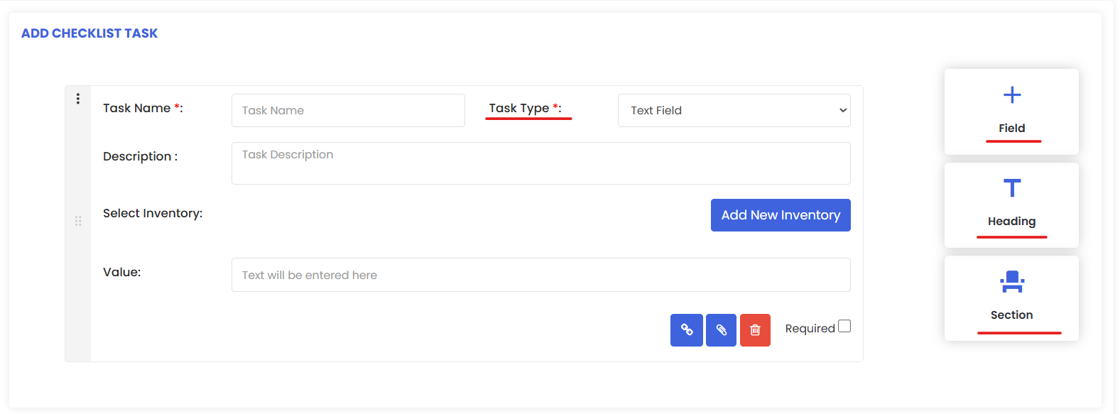 The task type selected for each checklist item determines the input format the technician sees in the mobile app. For example, a text field task will prompt a typed response, while other types may require a selection, photo, or numerical value.