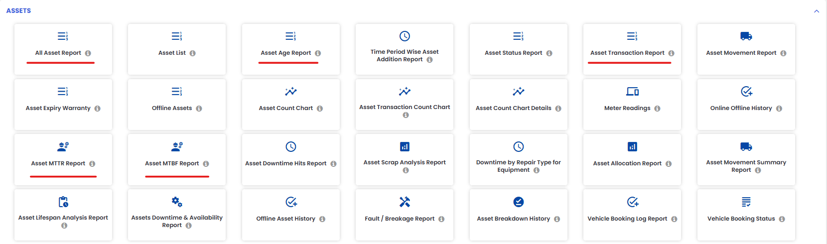 Asset reports are accessible from the Reporting section in the left-hand navigation menu. These reports are designed to give maintenance teams and managers a clear picture of how assets are performing, how old they are, and what activity has taken place against them. The MTTR and MTBF reports are particularly valuable for identifying assets that require frequent attention or are prone to failure.
