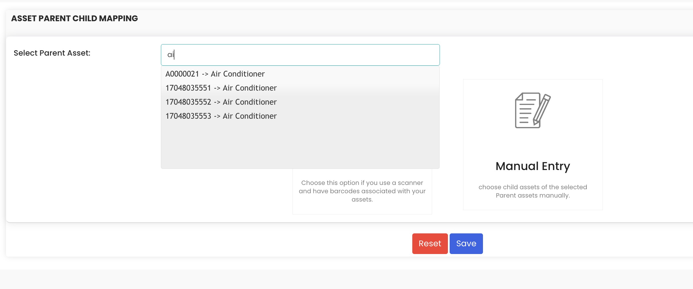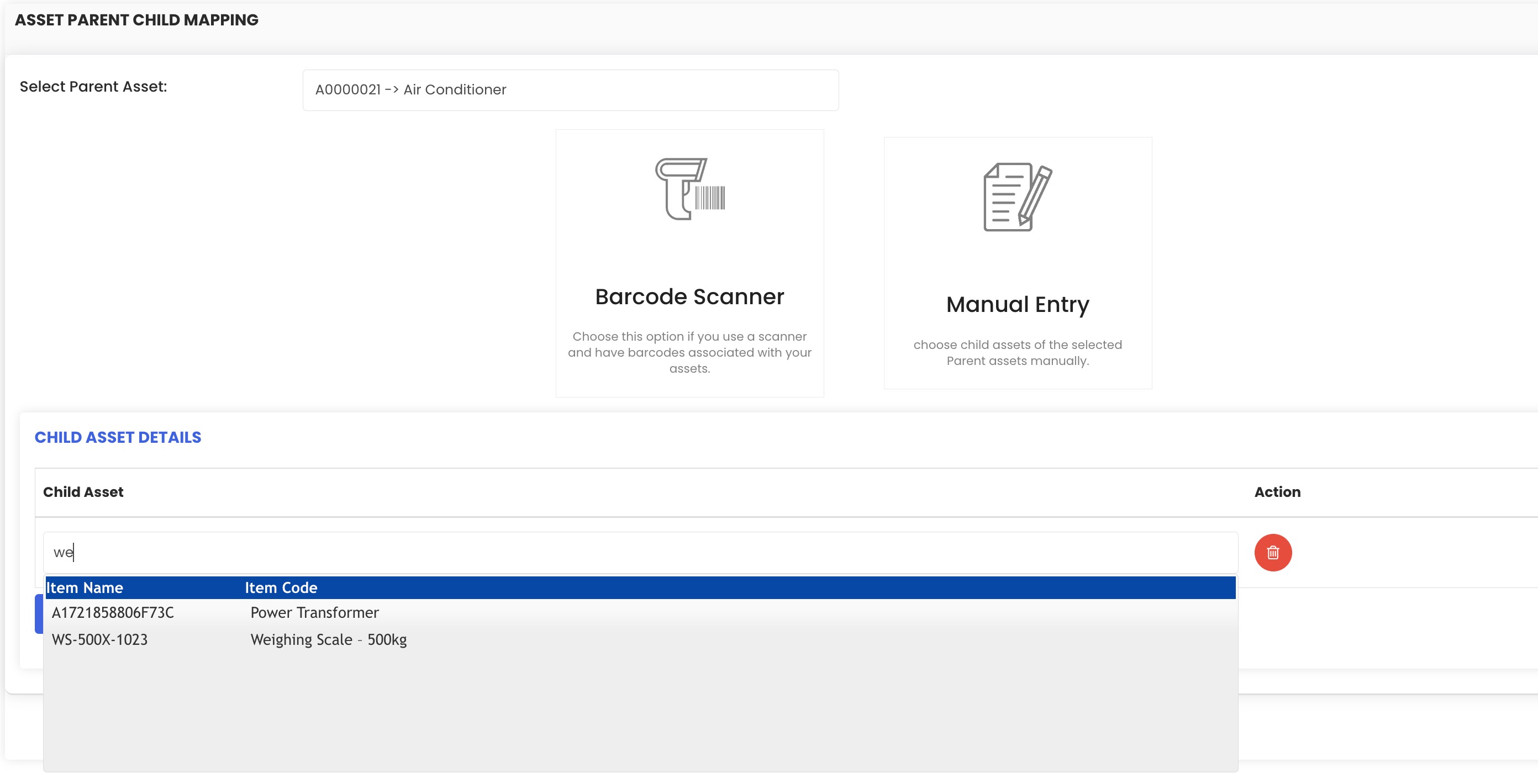 - Barcode Scanner – Scan the barcode of the parent and child assets directly
