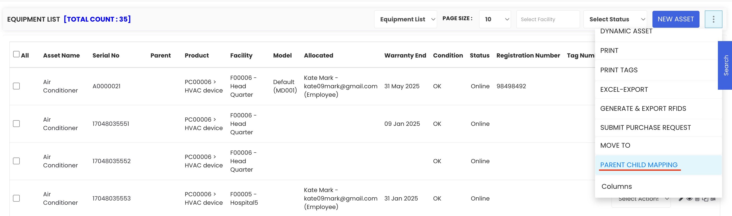 Select the parent asset — this is the main asset to which child assets will be linked. For example, you might select an air conditioner as the parent.