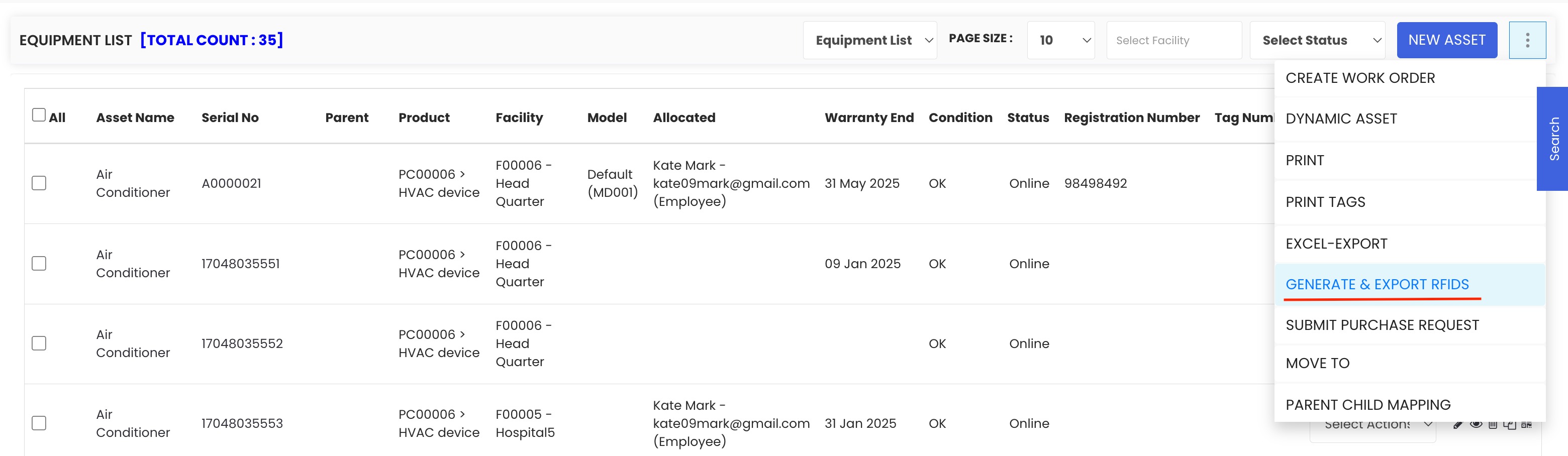 Click the three dots menu on the Equipment Listing page and select Generate and Export RFIDs. A list of all assets in the system will open.