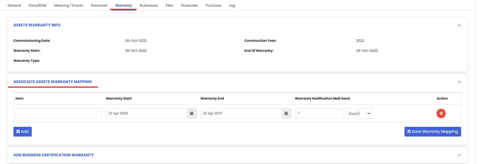 An Associated Item Warranty Mapping records the warranty details of a part or item linked to a specific asset in your system. Each mapping captures the associated item, the warranty start and end dates, and notification settings — giving you a complete warranty trail for every asset in your inventory.