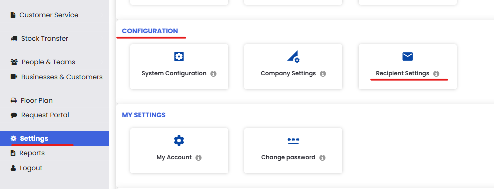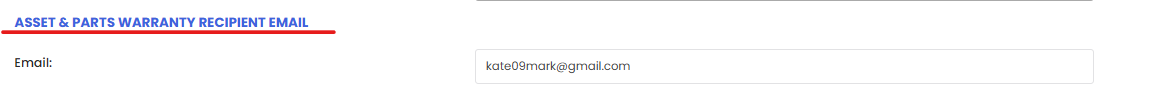 To ensure warranty reminder emails are received, go to Settings → Configuration → Recipient Settings. Locate the Asset and Parts Warranty Recipient Email field and enter the appropriate email address.