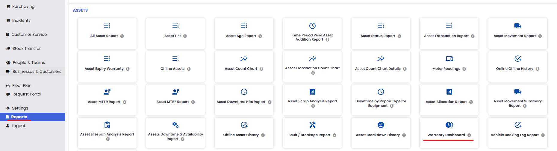 To access the Warranty Dashboard, go to Reports → Asset → Warranty Dashboard. Here you can view: