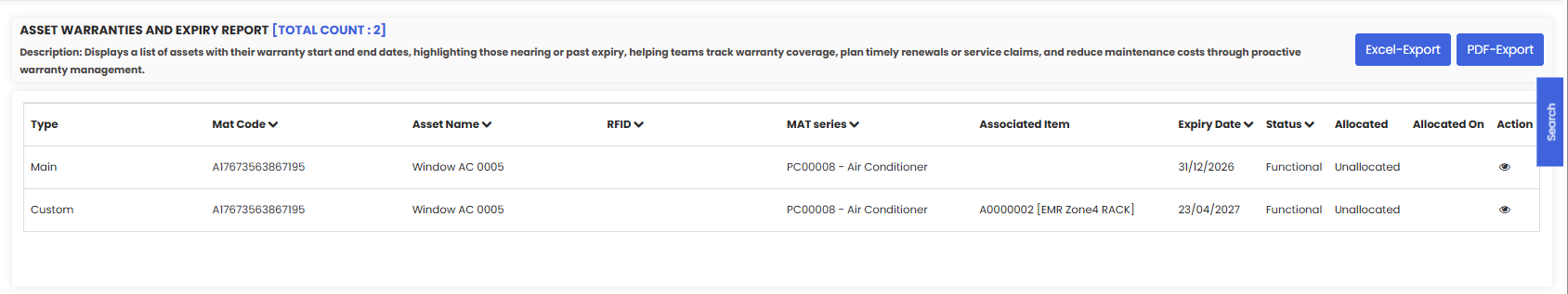 - Check the Expiry Warranty Report for exports. Use the Excel or PDF export options for audits or vendor communications.